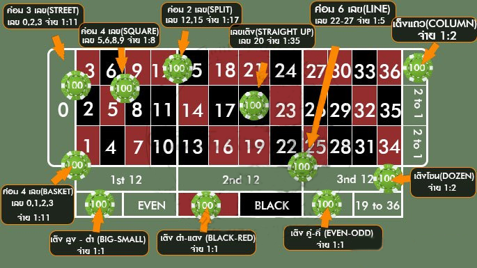 - ผู้เล่นสามารถเลือกวางเดิมพันในหมายเลข หรือรูปแบบที่ต้องการ อาจมาจากความชอบหรือการคาดการณ์ของแต่ละบุคคล (ทั้งนี้การเลือกแต่ละรูปแบบนั้น จะมีสัดส่วนการจ่ายที่แตกต่างกันไป)