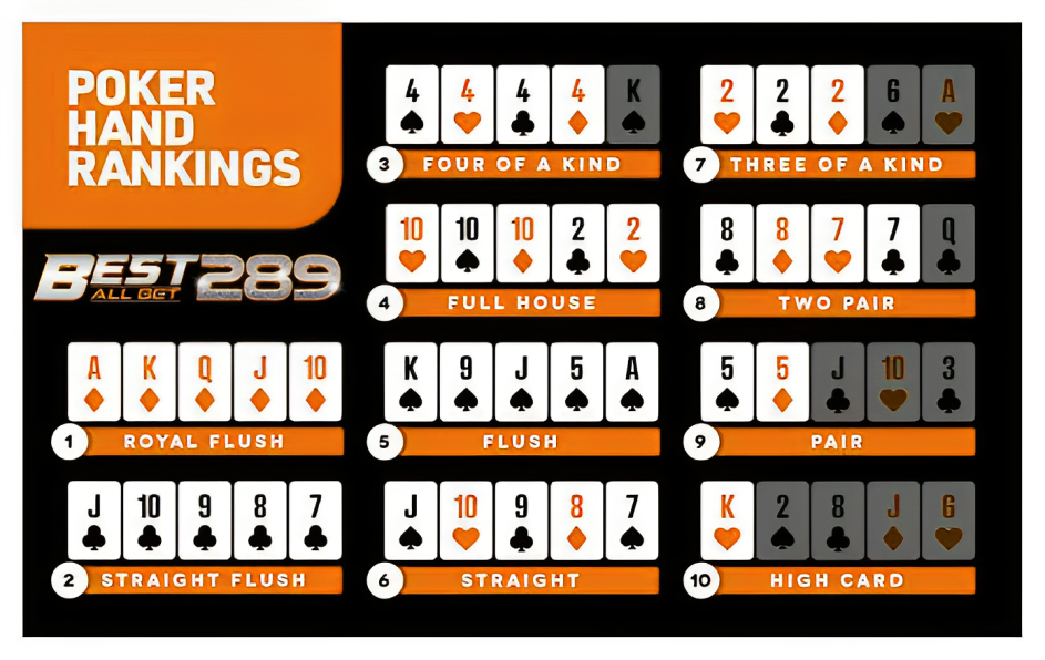 ลำดับไพ่โป๊กเกอร์นั้นมีทั้งหมด 10 แบบ เรียงจากใหญ่ไปเล็ก โดยมีลำดับต่อไปนี้